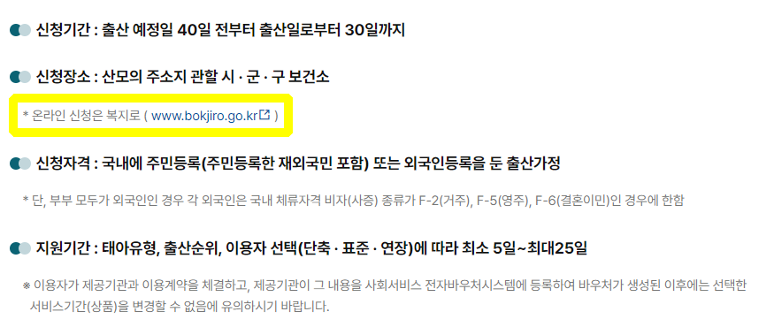 - 신청은 복지로 홈페이지에서 출산 예정일 40일 전부터 출산 후 30일 이내에 가능합니다.