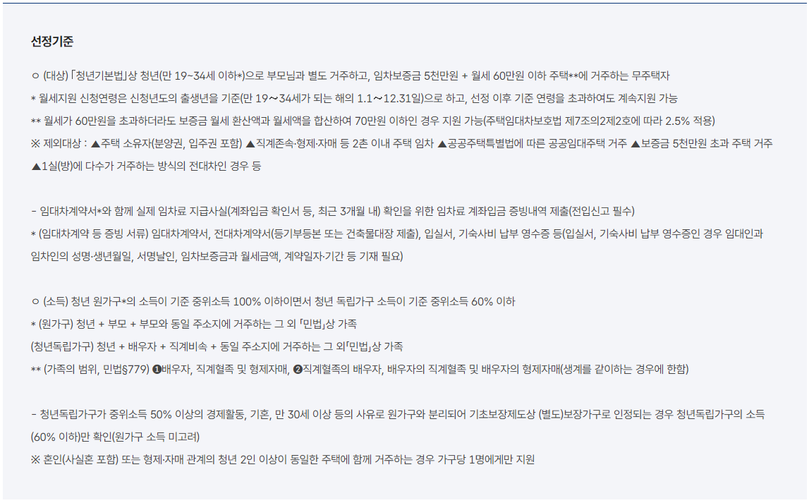- 지원 대상: 만 19세~34세 청년, 임차보증금 및 소득 요건 충족 필요
