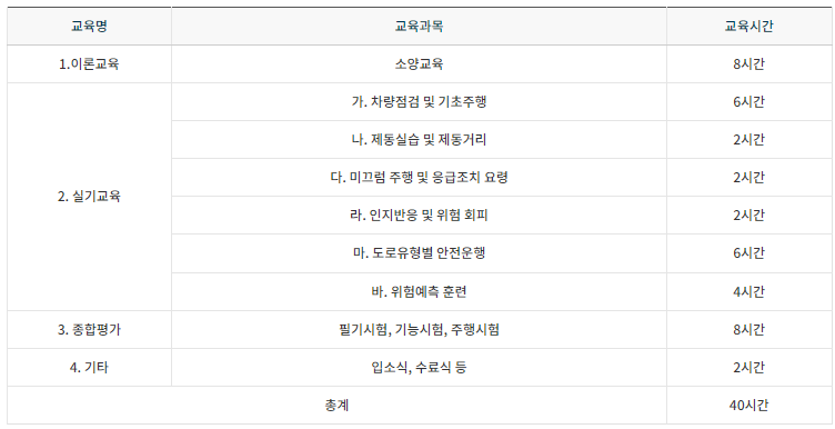 | 실기 교육 | 실제 차량을 이용한 운전 기술 습득 | 4시간 |